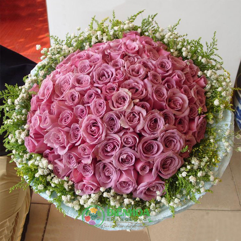 99 bông hồng tình yêu chung thủy gồm 99 bông hồng tím bó tròn, phía bên ngoài được bao bọc bởi những bông hoa babi xinh xắn. Hoa hồng tím tượng trưng cho tình cảm thủy chung son sắt trong tình yêu, đặc biệt nó tượng trưng cho tình yêu từ cái nhìn đầu tiên. Vậy nên, nếu bạn đang gặp một tình yêu “sét đánh” nào đó, hãy gửi tặng người ấy món quà đặc biệt này nhé.