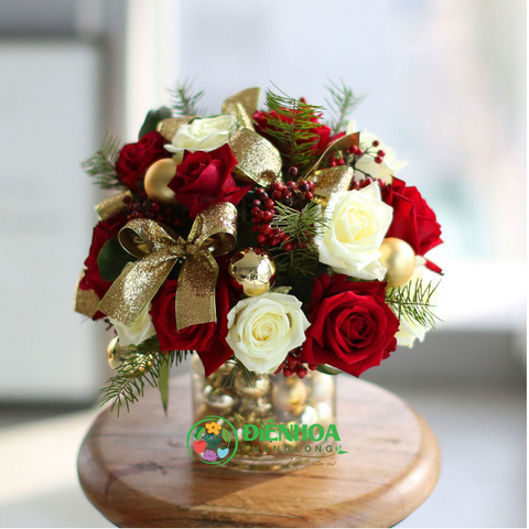 Bình hoa Giáng sinh đẹp nhất được thiết kế với hồng đỏ, hồng trắng, đan xen đào đông và quả châu. Chỉ vài nét chấm phá với ruy băng vàng, giỏ hoa như mang Giáng sinh đến thật gần. Bình hoa còn thu hút bởi những quả trang trí hình tròn phía trong bình hoa, thật là một quà tặng hoàn hảo cho Giáng sinh. Bình hoa thích hợp đặt trên bàn làm việc, phòng khách gia đình để làm ngôi nhà của bạn thêm ấm áp.