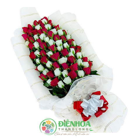 Bó 100 bông hồng gồm hồng trắng và hồng đỏ xếp xen kẽ. Với sự hòa quyện của hai tông màu trắng, đỏ, bó hoa mang đến một tình yêu nồng nàn, ấm áp và ngọt ngào. Hồng đỏ như những đam mê, khát vọng của người con trai và hồng trắng là sự thanh khiết, dịu dàng của người con gái. Hai tính cách đối lập nhưng lại bổ xung, mang đến những điều mới lạ tạo nên tình yêu, hạnh phúc gia đình.