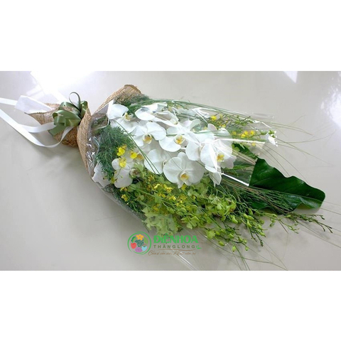 Bó hoa lan hồ điệp gồm hoa hồ điệp trắng, lan xanh được thiết kế theo dáng dài. Những bông hồ điệp vươn dài trắng muốt trên nền xanh mát của lá và hoa lan tạo thành bó hoa sang trọng, quyến rũ. Bó hoa được dùng cho tất cả các mối quan hệ thân thiết như tặng ông bà, tặng bố mẹ, tặng vợ, người yêu, thầy cô giáo, tặng cho đối tác quan trọng, tặng sếp…