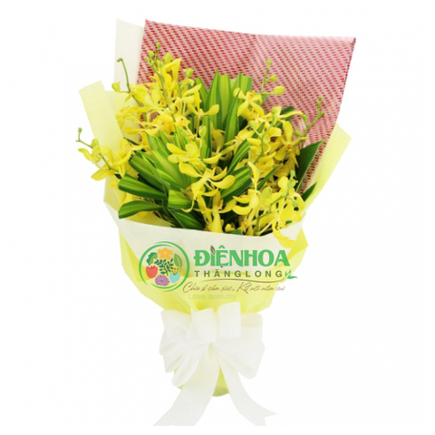 Bó hoa lan mokara vàng đẹp được thiết kế hoàn toàn từ hoa lan mokara xen trúc bách hợp xanh. Đây là loài hoa đẹp với màu vàng chanh tươi sáng, hoa được đặc biệt ưa chuộng bởi thời gian tươi lâu, dễ chăm sóc, bảo quản. Kiểu dáng bó dài thanh thoát phù hợp tặng hội nghị, hoa mừng đại biểu, tặng khách hàng,…