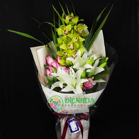 Bó hoa lan và hoa ly được thiết kế 1 mặt, theo dáng bó dài gồm những loài hoa sang trọng: hoa địa lan xanh, hoa ly trắng, hoa hồng phấn. Tone màu trắng xanh xen một chút hồng gợi cảm giác hài hòa, nhẹ nhàng nhưng vẫn toát lên vẻ sang trọng, quý phái. Bó hoa thích hợp dành tặng mẹ, vợ, bạn gái, những đối tác quan trọng, sếp… chúc mừng kỷ niệm, mừng sinh nhật, mừng ngày 8/3, Ngày của mẹ, ngày 20/10, ngày 20/11…