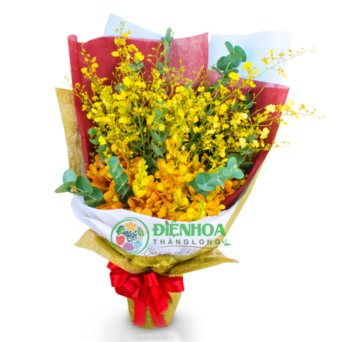 Bó hoa lan vàng được thiết kế theo tone màu vàng, với sự phối hợp của hoa lan vũ nữ và hoa lan mokara. Những bông hoa vũ nữ mềm mại bên cạnh những bông mokara quyến rũ làm bó hoa thêm phần đặc biệt. Với ruy băng đỏ bó hoa càng rực rỡ, nổi bật trong bất cứ không gian nào. Bạn có thể dành tặng bó hoa này cho ông bà, bố mẹ, những người bạn ngưỡng mộ, sếp, tặng khách hàng, hoa hội nghị…