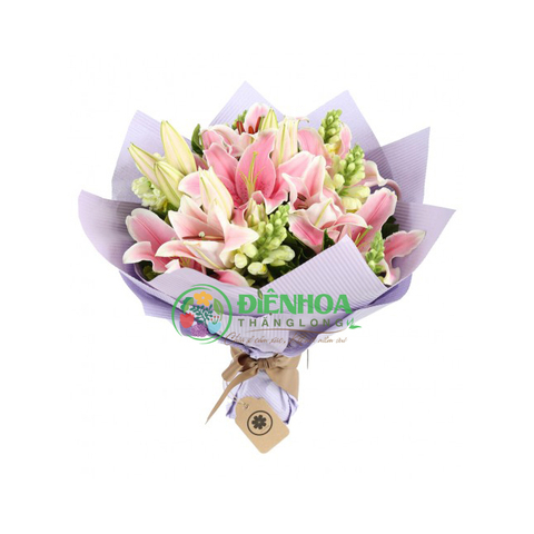 Bó hoa ly hồng tặng mẹ được kết hợp kéo léo giữa ly hồng, móm sói trắng với giấy gói mềm mại làm tôn lên màu hồng đáng yêu. Màu hồng là màu của những xúc cảm yêu thương, màu biểu hiện của sự nữ tính. Bạn có thể gửi bó hoa ly hồng để chúc mừng sinh nhật, kỷ niệm… thay cho những lời yêu thương cho mẹ, vợ, bạn gái…