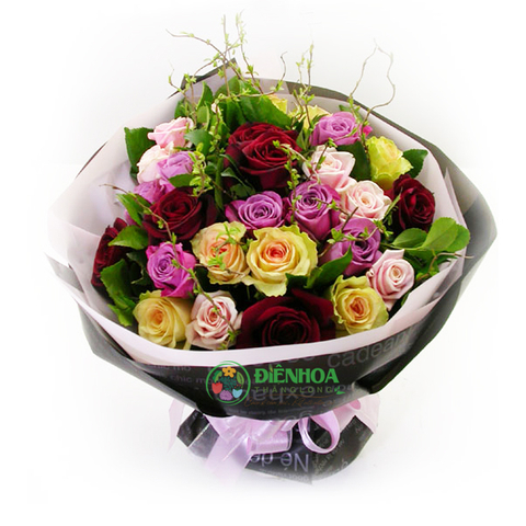 Sản phẩm bó hoa tình yêu ngọt ngào gồm hồng đỏ, hồng kem vàng, hồng tím cao cấp, với cách phối màu tự nhiên, sang trọng. Hoa hồng được coi là sứ giả dễ thương luôn mang đến những thông điệp diệu kỳ về tình yêu. Một bó hoa hồng đủ màu, nhỏ xinh mang đến vẻ tươi tắn, ngọt ngào sẽ là món quà thật dễ thương cho tất cả các dịp.