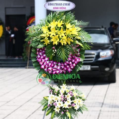 Mẫu vòng hoa chia buồn gồm hoa lan tím, hoa ly vàng, hoa loa kèn và các phụ liệu làm nổi bật tông màu tím, vàng. Hoa lan tím thể hiện sự lưu luyến khi phải chia ly. Ở Việt Nam, hoa lan và hoa ly thường được dùng trong đám tang thể hiện sự nhớ thương khi phải tiễn biệt.