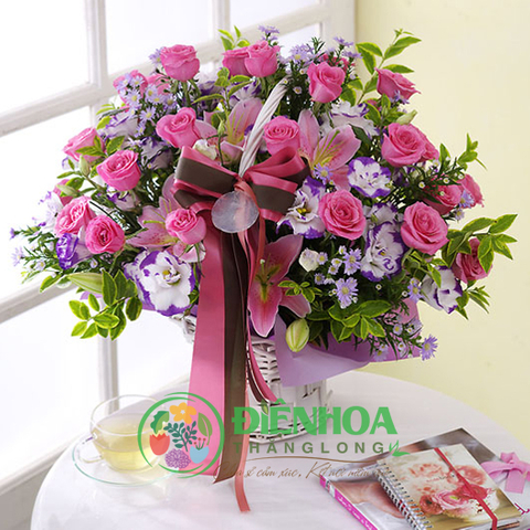 Giỏ hoa hồng phấn dễ thương được thiết kế với hồng phấn, cát tường tím viền, và các phụ liệu khác làm nổi bật tông màu hồng lãng mạn. Nếu một ngày nào đó bạn nhận được giỏ hoa này thì có nghĩa bạn thực sự là một cô gái nữ tính, đáng yêu. Giỏ hoa thích hợp tặng cho hầu hết các dịp chúc mừng, sinh nhật, ngày Lễ tình yêu, ngày Quốc tế phụ nữ…