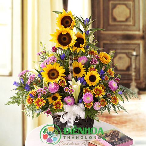 Giỏ hoa tặng sinh nhật đẹp gồm hoa mặt trời rực rỡ, hoa cúc chùm vàng, cúc nhật tím và các phụ liệu… qua bàn tay khéo léo của các thợ thiết kế của Điện Hoa Thăng Long tạo thành giỏ hoa tinh tế và hài hòa. Những bông hoa được cắm cao, vươn mình về phía trước như những bông hướng dương luôn hướng tới mặt trời. Gam màu vàng chủ đạo tượng trưng cho niềm tin, hy vọng và sự uy quyền. Trưng bày giỏ hoa này trong phòng khách gia đình hay nơi làm việc đều làm bừng sáng không gian, hứng khởi trong công việc cũng như tạo không khí ấm áp trong gia đình. Giỏ hoa thích hợp cho các dịp gửi tặng sinh nhật bố mẹ, vợ, bạn gái, tặng sếp, mừng khai trương…