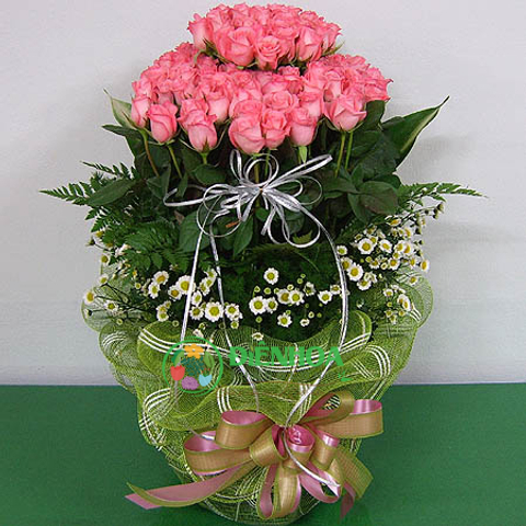 Giỏ hoa tươi vững vàng gồm 100 bông hồng phấn đậm được xếp khéo léo phía trên, ở dưới đệm những bông thạch thảo xinh xắn. Hồng phấn đậm không rực rỡ nhưng mang vẻ đằm thắm, quý phái, là biểu tượng của lòng biết ơn và kính trọng. Cuộc sống luôn có những khó khăn, thử thách và chỉ cần chúng ta đồng lòng thì sẽ vượt qua tất cả để đến bến bờ hạnh phúc. Giỏ hoa chính là món quà ý nghĩa dành tăng những người đã luôn đồng hành cùng chúng ta trên mỗi bước đường đời.