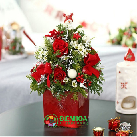 Sự kết hợp mới lạ dựa trên hình ảnh cây thông Noel truyền thống tạo nên sản phẩm hoa Giáng sinh ấm áp mà độc đáo. Những bông hồng đỏ, phối hợp cùng lá thông xanh, thanh liễu trắng, chuỗi ngọc đỏ, cùng những ngôi sao lấp lánh mang tới một hộp hoa mang đậm nét Giáng sinh truyền thống. Nếu bạn muốn sưởi ấm ngôi nhà, văn phòng hay tặng món quà Noel thú vị, bất ngờ cho ai thì mẫu hoa này là một gợi ý hoàn hảo.
