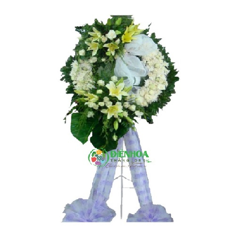 Vòng hoa tang lễ Hà Nội gồm hoa cúc trắng, hoa hồng trắng, hoa ly vàng theo tone màu trắng vàng. Màu trắng là một sự lựa chọn phù hợp trong sắp xếp tang lễ bởi nó tượng trưng cho sự tinh khiết, tôn kính và sang trọng. Hoa màu vàng mang tới sự ấm áp cho buổi tiễn đưa bớt phần ảm đạm, đau buồn. Điện Hoa Thăng Long hiểu rằng mỗi lẵng hoa chia buồn là biết bao tâm tư, tình cảm mà bạn muốn gửi gắm tới người đã mất và gia chủ. Chúng tôi nguyện là người trao trọn những yêu thương ấy đến người nhận với sự thành kính và trân trọng nhất.