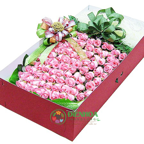 Hộp hoa 100 hồng phấn xinh xắn và đáng yêu. Hoa hồng phấn là loại hoa mang tone màu nhẹ nhàng, mơ mộng, được phái đẹp đặc biệt yêu thích. 100 bông hồng với ý nghĩa mình mãi yêu nhau. Thật hạnh phúc khi cảm nhận được trọn vẹn tình cảm của người ấy trao cho mình. Hộp hoa được thiết kế dành tặng riêng cho một người, chỉ 1 người thương duy nhất.