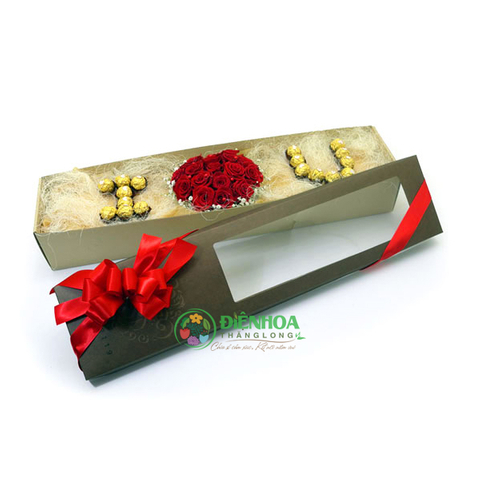 Hộp hoa tươi I love you là một mẫu hoa đặc biệt, một sự kết hợp “2 trong 1” tuyệt diệu. Những người thợ thiết kế hoa của chúng tôi sáng tạo, kết hợp hài hòa giữa hoa hồng và socola. Từ bao đời, hoa hồng và socola luôn là biểu tượng của tình yêu lãng mạn, và đầy đam mê. Những viên socola ngọt ngào được xếp thành chữ I, U, ở giữa là hình trái tim hồng đỏ, làm điểm nhấn cho toàn bộ hộp hoa. Sản phẩm thích hợp tặng kỷ niệm ngày cưới, Lễ tình yêu. Chúng tôi tin rằng, hộp hoa này sẽ là kỷ niệm ngọt ngào, không thể quên của 2 người.