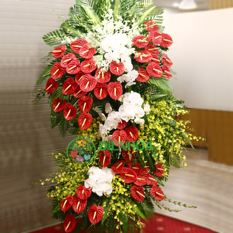 Kệ hoa khai trương 3 tầng sang trọng gồm hoa hồng môn đỏ, hoa lan hồ điệp trắng, lan vũ nữ, lan thái trắng, hoa hồng phấn được thiết kế theo tông màu trắng – vàng – đỏ, tông màu chủ đạo của những kệ hoa chúc mừng truyền thống. Lẵng hoa khai trương 3 tầng này sẽ thay lời cầu chúc may mắn, thành công, thịnh vượng tới người nhận trong ngày khai trương, khánh thành, lễ kỷ niệm thành lập doanh nghiệp…. Với kệ cao, cách cắm sang trọng chắc chắn sẽ là lựa chọn khiến bạn hài lòng khi muốn mua hoa chúc mừng.