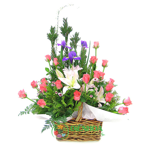 Lẵng hoa tình yêu đẹp gồm hồng phấn, ly trắng và các phụ liệu tạo thành giỏ hoa thanh lịch, nhẹ nhàng. Điện Hoa Thăng Long sẽ thay bạn nói lời yêu thương tới người thân yêu của bạn. Hãy dành tặng vợ, bạn gái của mình một lẵng hoa đẹp để người ấy thực sự xúc động trước tình cảm của bạn.