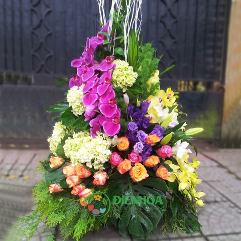 Lẵng hoa tươi VIP sang trọng gồm hoa tú cầu, hoa hồng cam, hoa hồng tím, lan hồ điệp tím, vàng và các phụ liệu tạo thành lẵng hoa tươi đẹp. Những bông hoa đan xen tạo thành một khối gắn kết. Lẵng hoa thích hợp tặng sinh nhật, chúc mừng thăng chức, mừng tân gia…