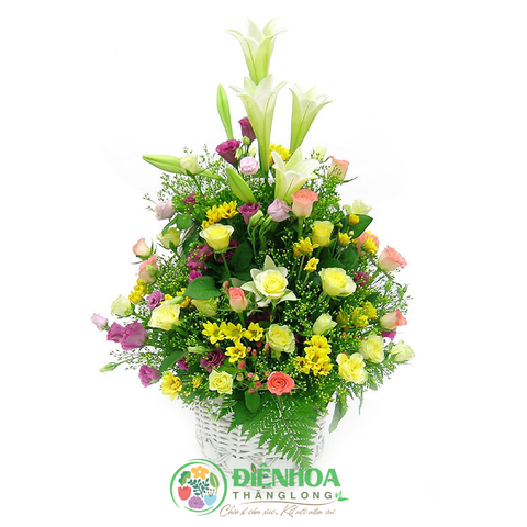 Giỏ hoa nắng mai gồm hoa hồng, hoa lys (bách hợp), cúc vàng… được thiết kế theo tone màu vàng. Giỏ hoa như những tia nắng ấm áp mang đến không khí vui tươi, rộn ràng. Còn gì vui hơn khi giỏ hoa này được đặt trên bàn làm việc của bạn vào buổi sớm mai.