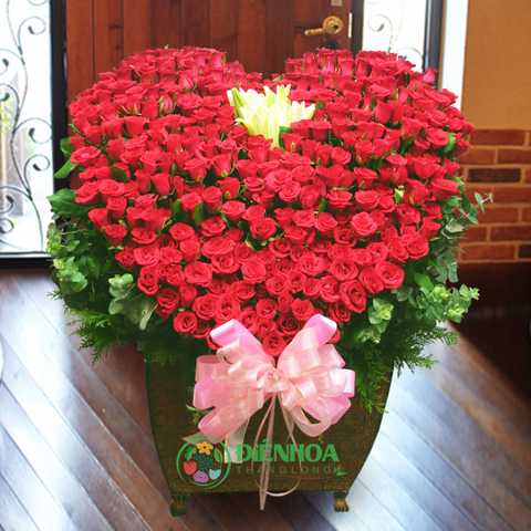 Lẵng hoa tình trăm năm gồm 365 bông hồng đỏ kết thành hình trái tim với hoa ly ở giữa. Giỏ hoa thể hiện sự quan tâm của bạn với người thương 365 ngày trong năm. Ngập tràn những yêu thương, cháy bỏng những đam mê, nồng nàn một tình yêu… là những thông điệp mà lẵng hoa này mang lại. Có biết bao điều bạn muốn nói với người ấy từ món quà này.