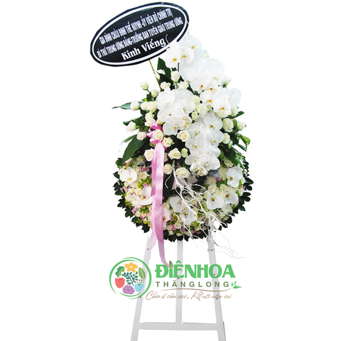Vòng hoa chia buồn sang trọng được thiết kế theo tông màu trắng gồm tú cầu, hồng trắng, đặc biệt là những cành hồ điệp trắng là điểm nhấn tạo sự sang trọng cho vòng hoa. Vòng hoa với màu trắng trang nhã, như lời nguyện cầu cho người đã khuất sẽ được thanh thản ở một thế giới khác. Đồng thời cũng là lời sẻ chia trước những mất mát của người ở lại, đừng quá đau lòng, hãy hướng về tương lai phía trước.