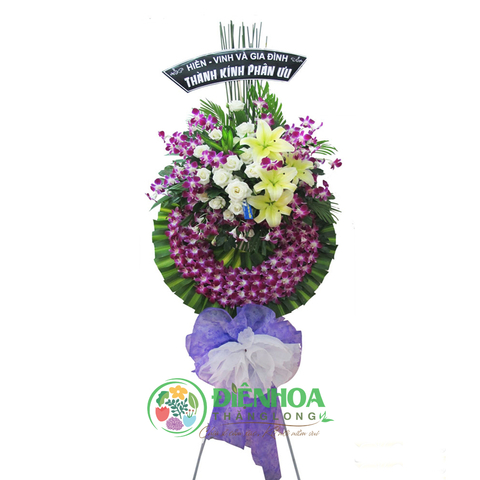 Sản phẩm gồm hoa lan tím, ly vàng, hồng trắng được sắp xếp khéo léo, cẩn thận tạo thành 1 vòng hoa đám ma đẹp. Màu tím như chứa đựng nỗi buồn thương, tiếc nuối với người đã mất. Gửi điện hoa chia buồn để chia sẻ những mất mát của một người, một gia đình khi mất đi một thành viên.