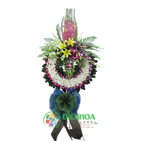 Vòng hoa viếng đám tang được thiết kế với lan tím, lan trắng, ly vàng theo hình vòng tròn với 1 cụm hoa phía trên. Đây là mẫu hoa khá phổ biến trên toàn quốc. Hình tròn tượng trưng cho quy luật của cuộc sống là sinh – lão – bệnh – tử. Vòng hoa hình tròn là lời nguyện cầu của người ở lại đối với người đã khuất với niềm hy vọng linh hồn của người đã khuất được siêu thoát.
