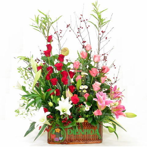 Giỏ hoa tươi vườn xuân gồm hoa loa kèn, hoa hồng, ly hồng và các phụ liệu kết hợp hài hòa như một khu vườn xuân trong trẻo, ngát hương. Tặng ai đó giỏ hoa này là lời cầu mong họ luôn được hạnh phúc, ấm áp, sum vầy.